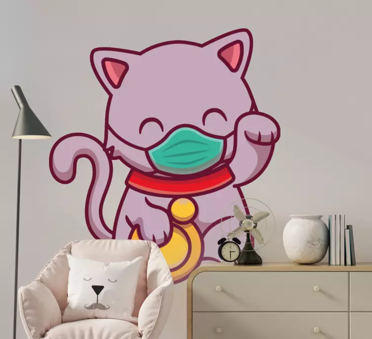 Referentienummer: A48967Een vrolijke kat wordt afgebeeld met een beschermend masker, wat een speelse karakter toont. Het ontwerp benadrukt de levendige kleur en ronde kenmerken van de kat, wat een speelse toets geeft. Deze weergave benadrukt vreugde en veerkracht tijdens uitdagende tijden, en vangt een luchtige sentiment.