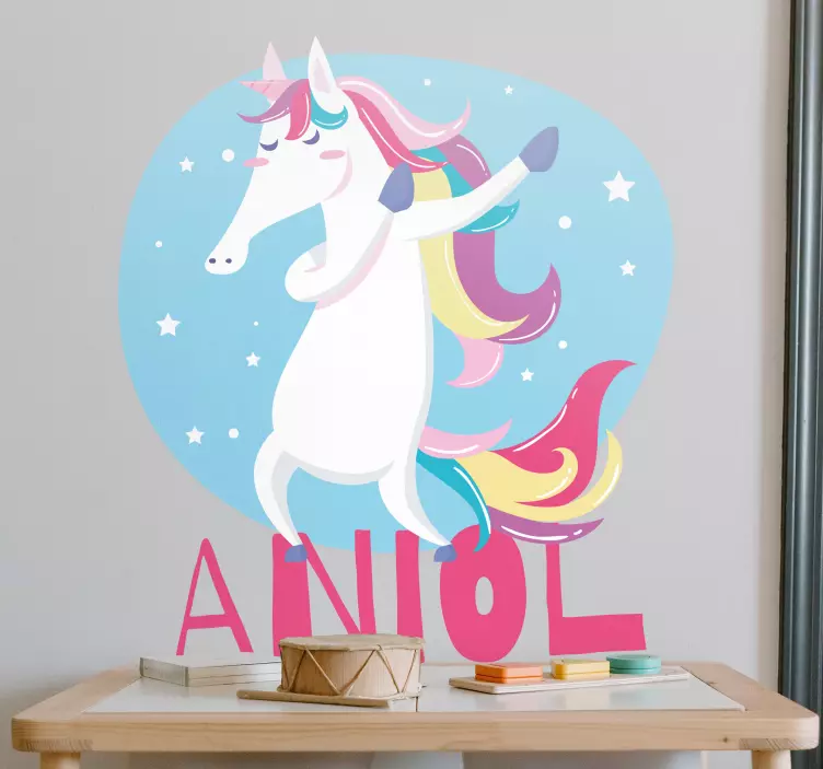 Referentienummer: A47669Een levendige eenhoorn danst vreugdevol tegen een rustgevende blauwe achtergrond, omringd door sterren. Dit ontwerp vangt de speelse geest van de kindertijd en verbeelding, waardoor het een heerlijke keuze is voor persoonlijke ruimtes. Het product kan gepersonaliseerd worden om een unieke touch toe te voegen.