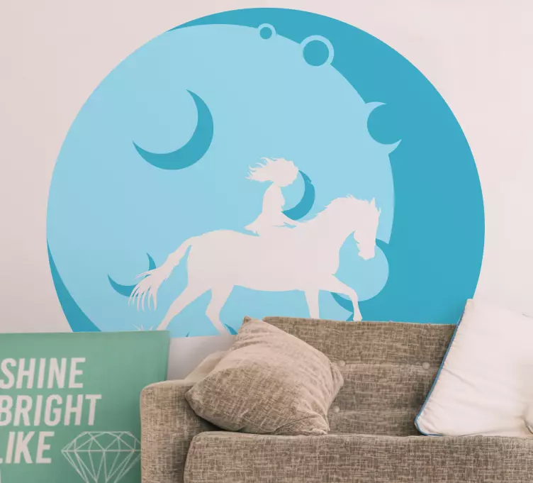 Referentienummer: A48385Een betoverend tafereel van een meisje dat op een paard rijdt tegen een serene blauwe maan achtergrond. De silhouetten creëren een dromerige sfeer, die gevoelens van vrijheid en avontuur oproept. Dit ontwerp vangt de essentie van een fantasierijke reis door de natuur, perfect om elke kinderkamer te verfraaien.