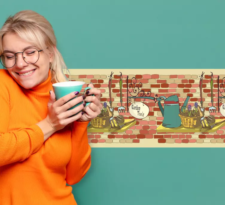 Breng kleur en leven in uw keuken en tuin met onze Stickerrand tuin gereedschap display. Dit grafische ontwerp is geïnspireerd door een speelse stenen muur en een vrolijke tekenfilm stijl, die perfect aansluit bij uw huishouden. Met zijn kleurrijke en decoratieve uitstraling is deze rand niet alleen functioneel maar ook een echte eyecatcher in uw keuken en tuin.