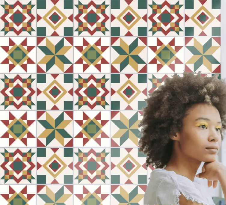Breng een frisse en moderne uitstraling in uw interieur met onze tegelsticker geometrisch motief tegels. Dit unieke ontwerp, dat sterren en abstracte vormen combineert, geeft een kleurrijke en symmetrische touch aan elke muur. De combinatie van geometrische elementen en cementtegels creëert een speelse sfeer die perfect is voor zowel woonruimtes als commerciële omgevingen. Laat uw muren stralen met dit prachtige motief!