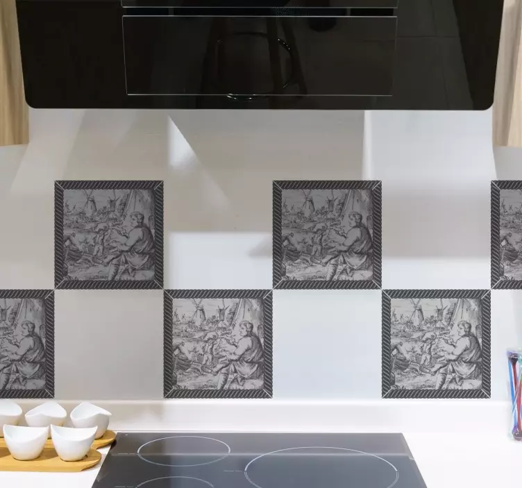 Deze tegelsticker historische scène tegels brengt een meesterlijk grafisch ontwerp van historische molens en heren in een prachtig zwart-wit patroon in uw ruimte. Het vakmanschap is artistiek en weerspiegelt een cultureel landschap dat elke muur transformeert in een verhaal vol geschiedenis en charme.