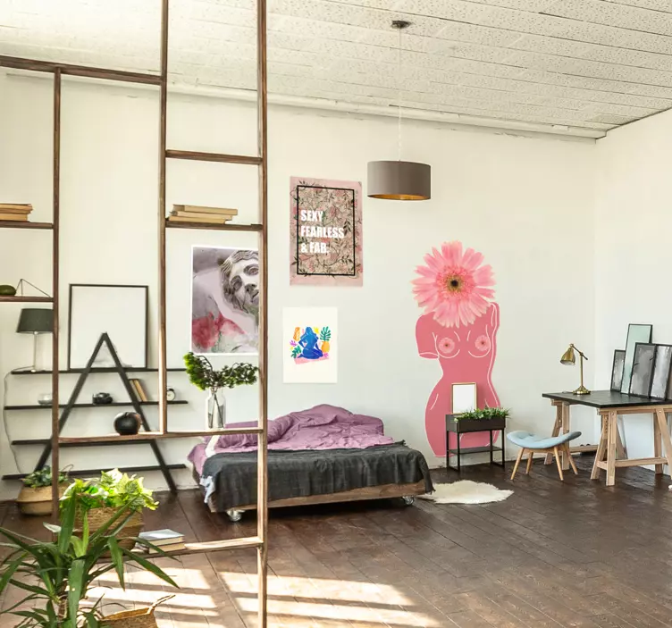 Unieke sticker met abstract vrouwelijk lichaam en bloemenhoofd