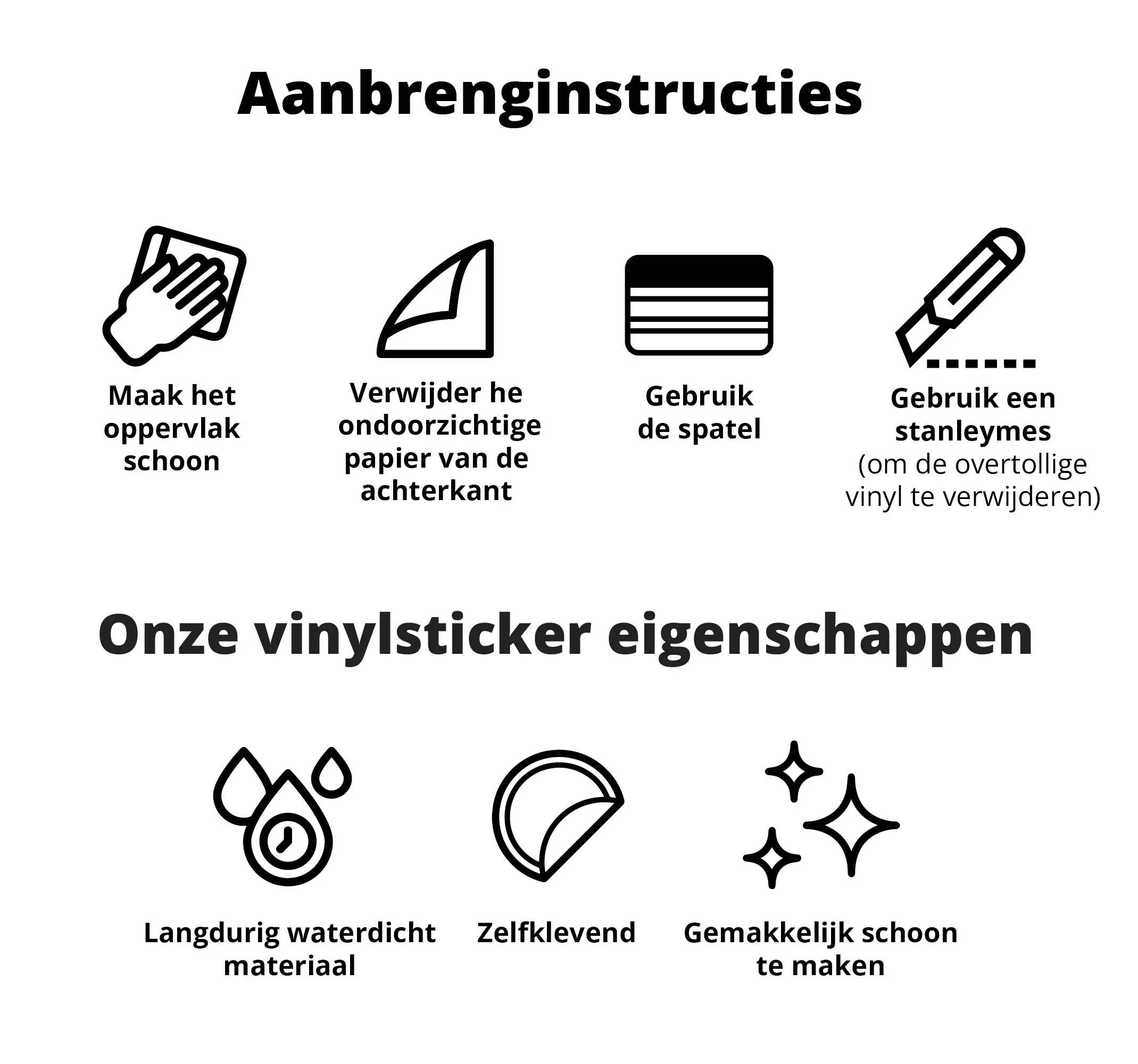 Inhoud: De sticker en accessoires in beschermende verpakking, plus een gratis voorbeeldsticker om hechting en toepassing te testen. Als je de sticker niet direct aanbrengt, bewaar deze dan plat.
