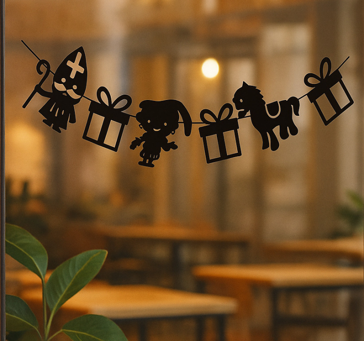 Referentienummer: A46278Breng de feestelijke sfeer van Sinterklaas naar uw etalage met onze kleurrijke Vlaggetjespakjes, piet & sint etalage sticker. Dit ontwerp is een waar kunstwerk, met een levendige combinatie van vrolijke kleuren en speelse afbeeldingen die de magie van het seizoen vastleggen. De satijnen afwerking zorgt ervoor dat het product geen reflecties veroorzaakt, wat betekent dat de schitterende kleuren optimaal tot hun recht komen, ongeacht de lichtinval. Geniet van de rijke kleurintensiteit zonder verblinding, wat deze sticker perfect maakt voor zowel binnen- als buitentoepassingen.