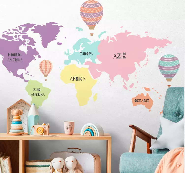 Wereldkaart muursticker Noordse kaart met luchtballonnen