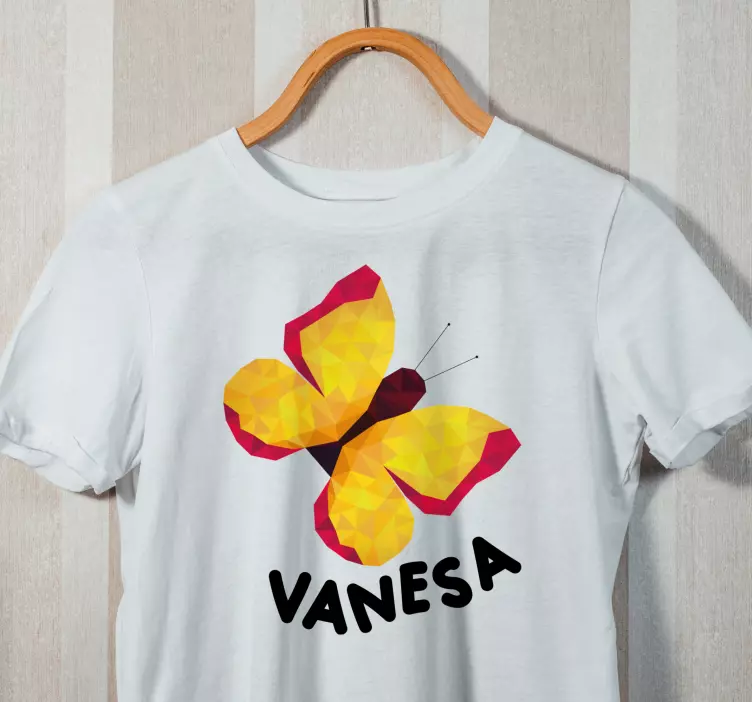 Referentienummer: T4993Dit charmante ontwerp bevat een levendige vlinder met een schitterende mix van gele en rode tinten. De geometrische vormen geven een moderne uitstraling, terwijl de gedurfde letters van de naam de persoonlijke aantrekkingskracht versterken. Perfect om een vrolijke en speelse sfeer te tonen.
