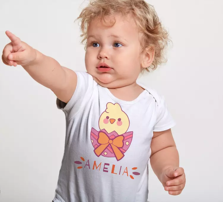 Dit Baby t-shirt schattig kuiken met strik is een schattige toevoeging aan de garderobe van uw kleintje! Het ontwerp toont een vrolijk kuiken dat met een schattig lintje is versierd, waardoor het perfect is voor elke speelse gelegenheid. Met een levendig kleurenpalet en een speelse uitstraling, is dit t-shirt ideaal voor baby's die de wereld om hen heen willen verkennen. Het ontwerp is personaliseerbaar en kan worden aangepast met de naam van uw kindje, wat het een uniek en dierbaar item maakt. Dit schattige baby vogel t-shirt, met zijn ronde hals en korte mouwen, is perfect om die eerste herinneringen vast te leggen! Het is een geweldig cadeau voor een babyshower of een eerste verjaardag.