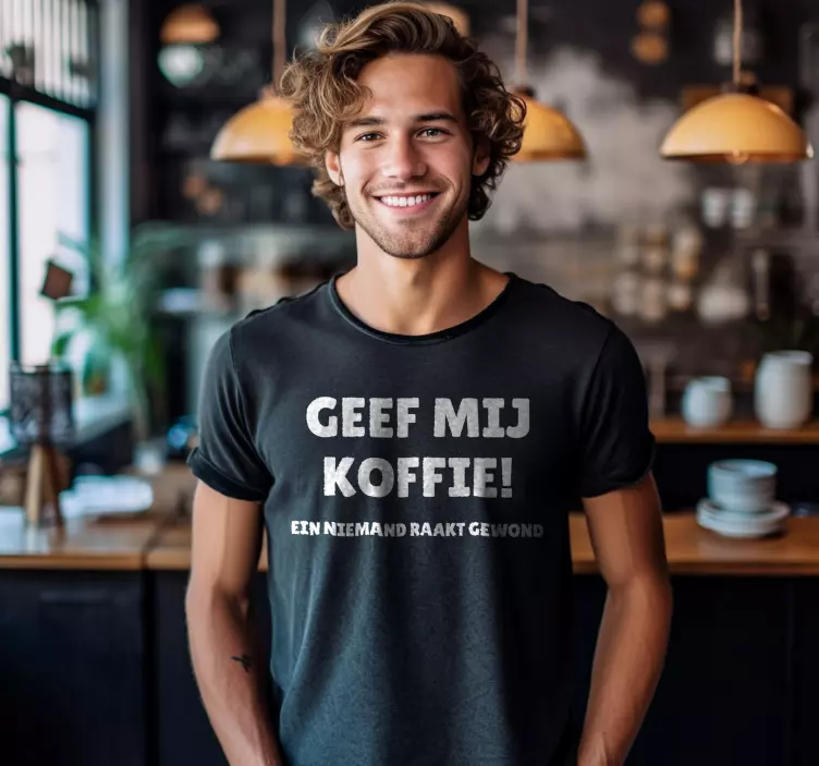 Dit geef mij koffie tekst op t-shirt! is perfect voor iedereen die van koffie houdt en graag een grappig citaat draagt. Het is een inspirerende manier om je liefde voor koffie te tonen en anderen aan het lachen te maken. Met dit T-shirt zul je zeker opvallen en een gespreksonderwerp zijn!