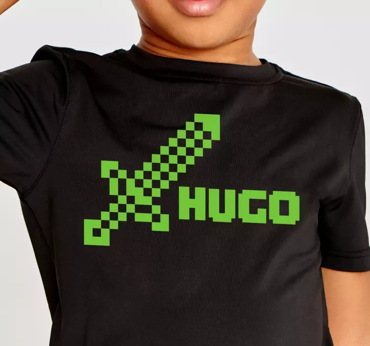 Referentienummer: T4921Dit levendige stuk bevat een gepixeld zwaardontwerp naast een aanpasbare naam. De gedurfde groene kleur tegen een slanke zwarte achtergrond creëert een opvallende visuele aantrekkingskracht, perfect voor jonge gamingliefhebbers. Het is een leuke, gepersonaliseerde toevoeging aan de garderobe van elk kind.