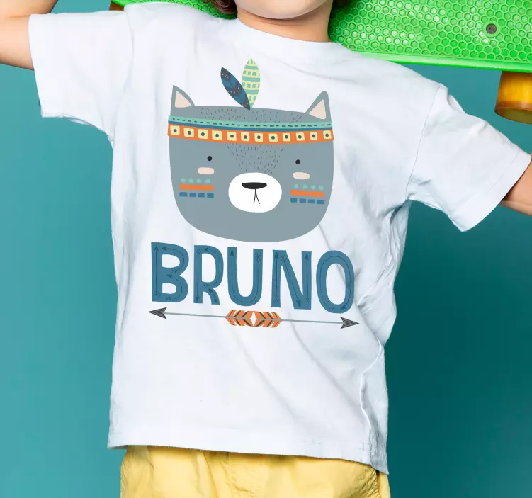 Referentienummer: T4968Dit ontwerp bevat een schattig berenhoofd met tribale elementen, benadrukt door levendige kleuren en een gepersonaliseerde naam. Het straalt een vrolijke sfeer uit die perfect is voor kinderen. De compositie is boeiend en visueel aantrekkelijk, waardoor het een ideale keuze is voor de kleintjes.