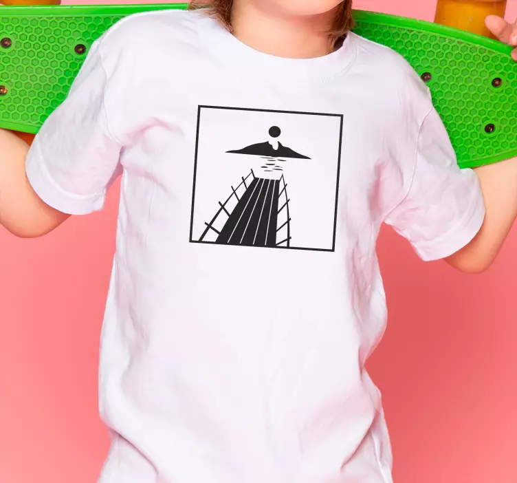Referentienummer: T4688Dit ontwerp toont een serene zonsondergang boven een steiger, met een kind met een skateboard. De beelden stralen een gevoel van avontuur en buitenplezier uit, perfect voor kinderen. Eenvoudige lijnen en vormen creëren een sterke contrast, waardoor het visueel aantrekkelijk is voor de kleintjes.