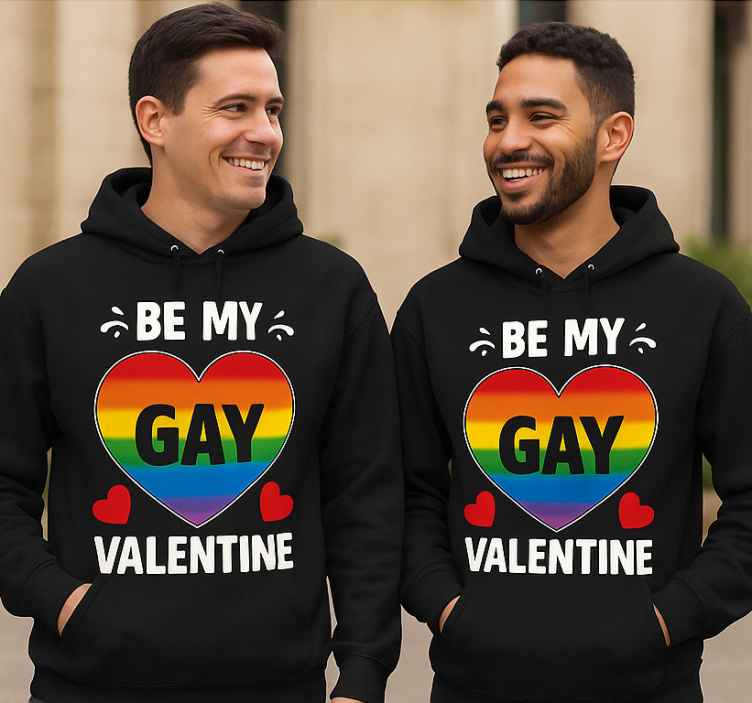Twee glimlachende mannen dragen bijpassende zwarte hoodies met een kleurrijk ontwerp. De grafiek toont een grote hart gevuld met regenboogkleuren en de tekst 'BE MY GAY VALENTINE' prominent weergegeven. Versierd met charmante rode harten, exemplificeert deze kleding liefde en inclusiviteit, perfect voor het vieren van LGBTQ+ relaties.