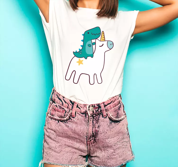 Referentienummer: T5138Dit charmante ontwerp bevat een fantasierijke scène met een eenhoorn gecombineerd met een dinosaurus, wat een leuke en speelse sfeer creëert. Heldere kleuren en schattige vormen versterken het speelse thema, waardoor het ideaal is voor casual kleding.