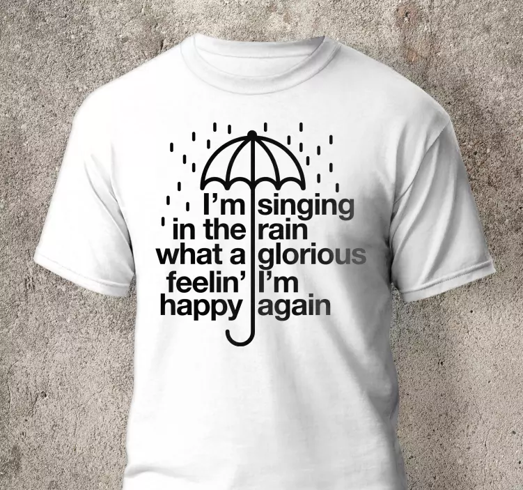 Ontdek het T-shirt blije regenparaplu quote, een vrolijk en uniek ontwerp dat de vreugde van zingen en de glorie van een regenachtige dag vastlegt. Met een grafisch ontwerp van een kleurrijke paraplu en inspirerende songteksten brengt dit T-shirt een gevoel van blijheid en optimisme, perfect voor elke gelegenheid!