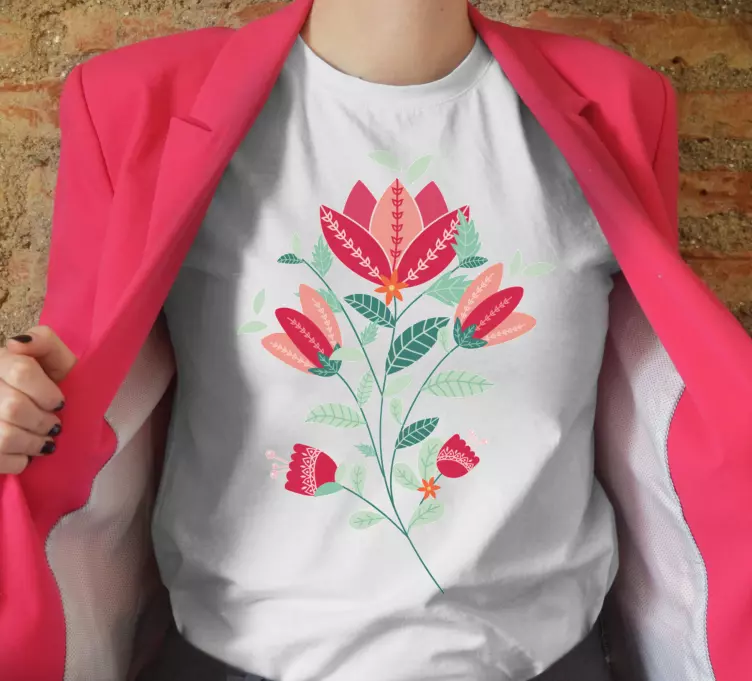 Het T-shirt bloemige bloesem arrangement brengt de schoonheid van de natuur tot leven met een prachtig ontwerp dat geïnspireerd is op folklore en traditionele tribale kunst. De handgetekende bloemen stralen levendigheid en kleur uit, perfect voor de lente. Dit shirt omarmt de flora met een botanische flair, waardoor het een must-have is voor iedereen die houdt van een kleurrijke en vrolijke uitstraling!