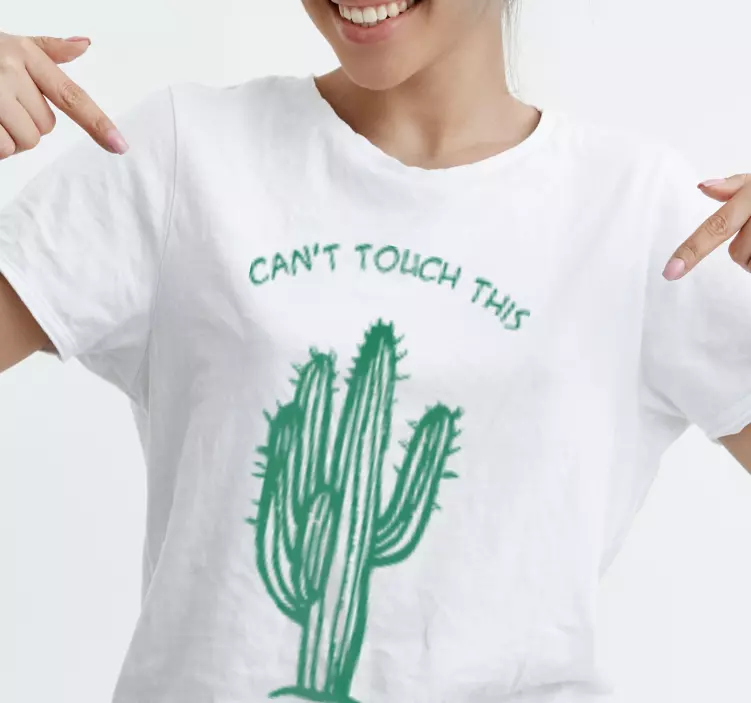 Referentienummer: T4734Dit speelse ontwerp toont een cactus met de tekst 'Can't Touch This' erboven. De levendige groene kleur contrasteert prachtig met de witte stof, waardoor het een grappig statementstuk is dat perfect is voor casual wear. Ideaal voor degenen die humor en unieke stijlen waarderen.