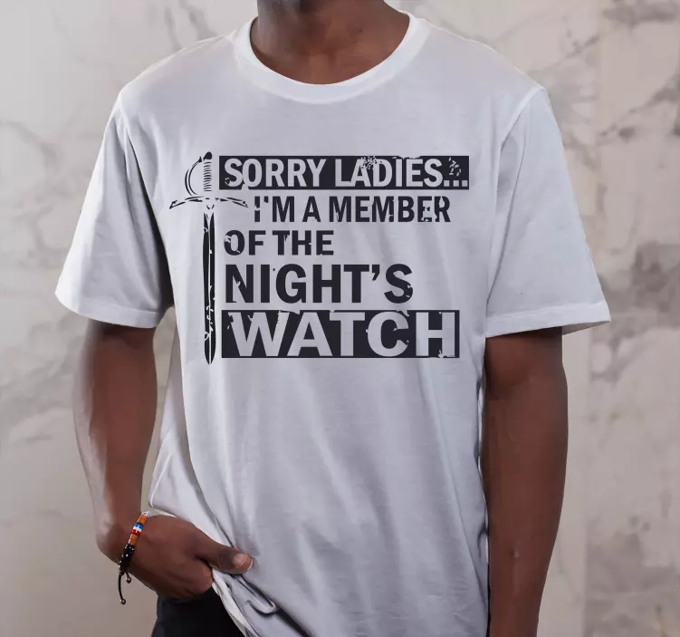 Referentienummer: T4932Dit witte shirt heeft een gedurfde uitspraak die het lidmaatschap van de night's watch benadrukt, gecombineerd met een opvallende zwaardgrafiek. Perfect voor degenen die hun fandom op een humoristische manier willen tonen terwijl ze genieten van comfortabele casual kleding.