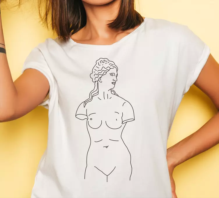 Dit T-shirt elegante vrouwelijke silhouet is een meesterwerk van grafisch ontwerp, geïnspireerd door de oud-Griekse kunst. Het t-shirt toont een prachtig standbeeld van een vrouw in een lijn kunst stijl, waardoor het een cultureel en artistiek portret is dat perfect past in een minimalistische en moderne modecollectie. De abstracte vormen en de subtiele kleuren maken dit t-shirt tot een must-have voor elke modebewuste vrouw!