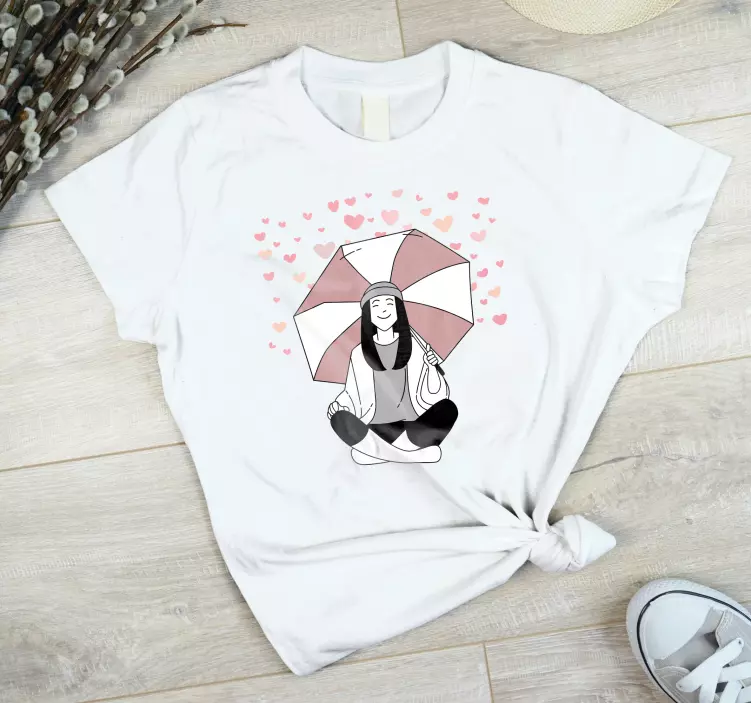 Dit T-shirt met charmant hartpatroon is een echte blikvanger! Met een schattige illustratie van een lachend meisje dat vrolijk onder een paraplu staat, omringd door hartjes, brengt dit ontwerp liefde en vrolijkheid in elke casual outfit. Dit comfortabele en vrouwelijke t-shirt is perfect voor elke gelegenheid, of het nu regent of de zon schijnt!
