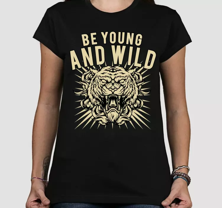 Referentienummer: T4848Dit ontwerp bevat een krachtige leeuwenkop met gedurfde typografie die de zin 'Be Young and Wild' toont. De felle uitdrukking van de leeuw straalt een gevoel van kracht en avontuur uit, wat het een opvallende keuze maakt voor mensen die hun wilde kant willen uitdrukken.