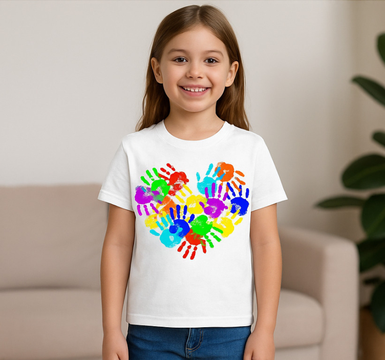 Het T-shirt met hartvormige handafdrukken t-shirt is meer dan alleen een kledingstuk; het is een statement! Dit T-shirt laat zien dat je om de wereld en de mensen om je heen geeft. Het is perfect voor het tonen van je liefde en kan gemakkelijk gecombineerd worden met verschillende outfits. Draag het op een zonnige dag of tijdens een gezellig samenzijn met vrienden; je zult stralen in dit prachtige ontwerp!