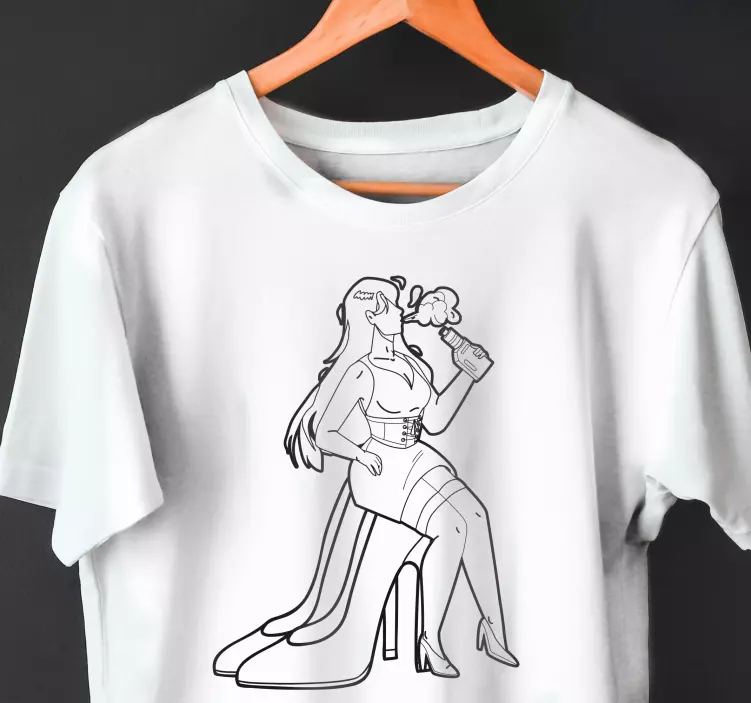 Referentienummer: T4959Omarm je stijl met deze chique illustratie van een zelfverzekerde vrouw die van een drankje nipt, elegant op hoge hakken. Het opvallende ontwerp vangt een mix van gedurfdheid en vrouwelijkheid, waardoor het een trendy en opvallende keuze is voor elke gelegenheid.