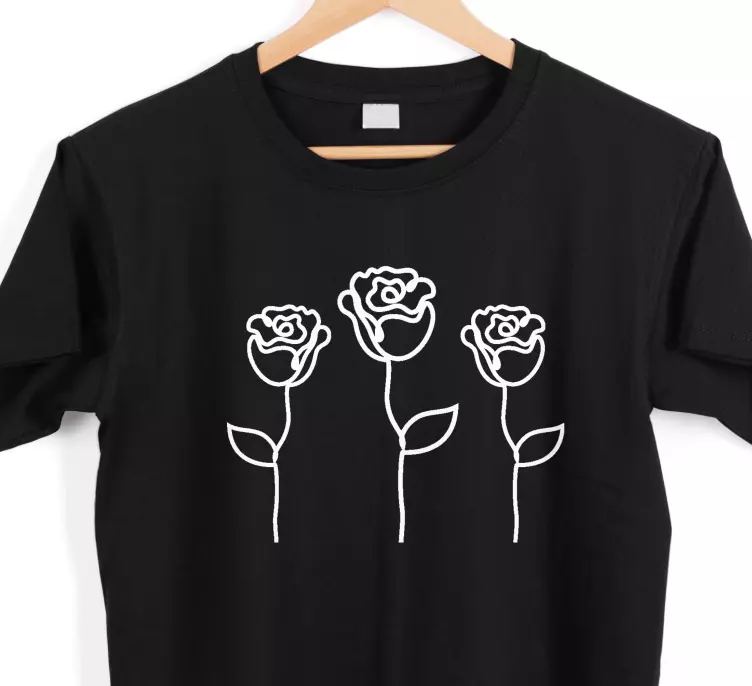 Referentienummer: T4404Dit stijlvolle stuk heeft drie elegant getekende rozen, die een minimalistische esthetiek belichamen. De zwarte stof vormt een perfect achtergrond, die de ingewikkelde lijntekeningen in het wit accentueert. Ideaal voor bloemenliefhebbers die een moderne touch aan hun garderobe willen toevoegen.