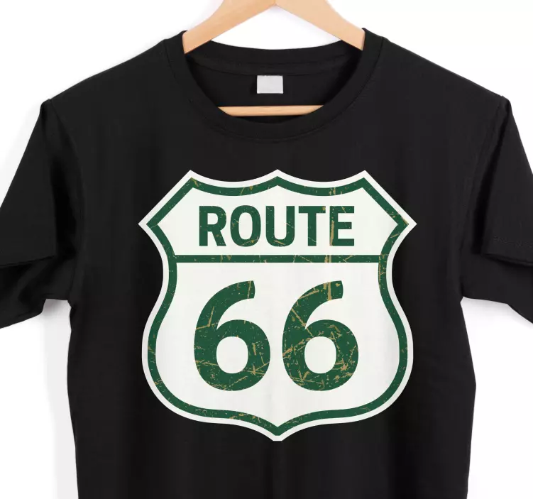 Referentienummer: T4636Dit ontwerp bevat een klassiek Route 66-embleem, dat een gevoel van nostalgie en avontuur oproept. De vintage esthetiek belichaamt de geest van reizen met zijn versleten uitstraling, waardoor het perfect is voor liefhebbers van iconische Amerikaanse wegen.