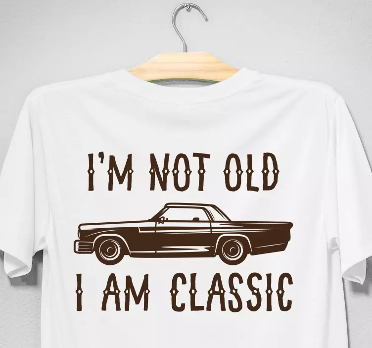 Referentienummer: T4519Dit ontwerp toont een vintage auto naast de speelse tekst, wat een humoristische uitspraak over ouder worden benadrukt. Het vangt perfect een nostalgische sfeer en spreekt de dynamiek binnen gezinnen aan, waardoor het ideaal is voor vader-zoon momenten.
