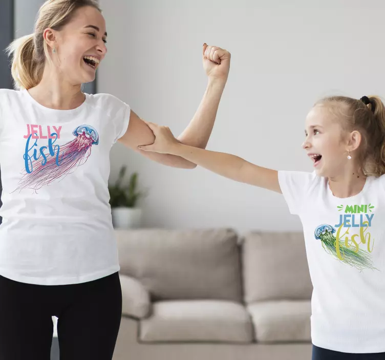 Referentienummer: T5235Dit levendige beeld toont een moeder en dochter die blije momenten delen, beiden gekleed in bijpassende tops met levendige afbeeldingen van kwallen. Het speelse ontwerp benadrukt hun band en creëert een leuke, kleurrijke sfeer, perfect om liefde en samenzijn uit te drukken.