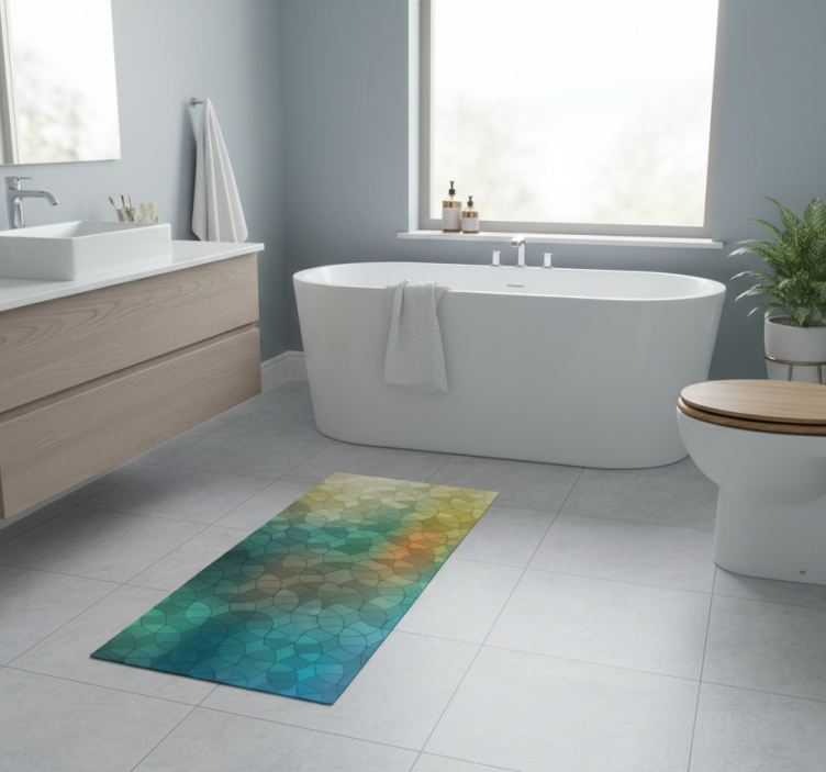 Referentienummer: R21314Breng een sprankelende en moderne uitstraling in uw badkamer met ons Vinyl vloerkleed badkamer 3d glaseffect. Dit unieke ontwerp creëert een visueel effect dat doet denken aan een glanzende glazen afwerking, waardoor het een prachtige aanvulling is op elke badkamer. De levendige kleuren en het realistische 3D-ontwerp zorgen ervoor dat uw ruimte er stijlvol en uitnodigend uitziet. Dit vloerkleed is niet alleen een lust voor het oog, maar ook uiterst praktisch, met kenmerken zoals antislip, krasbestendigheid en thermische isolatie.