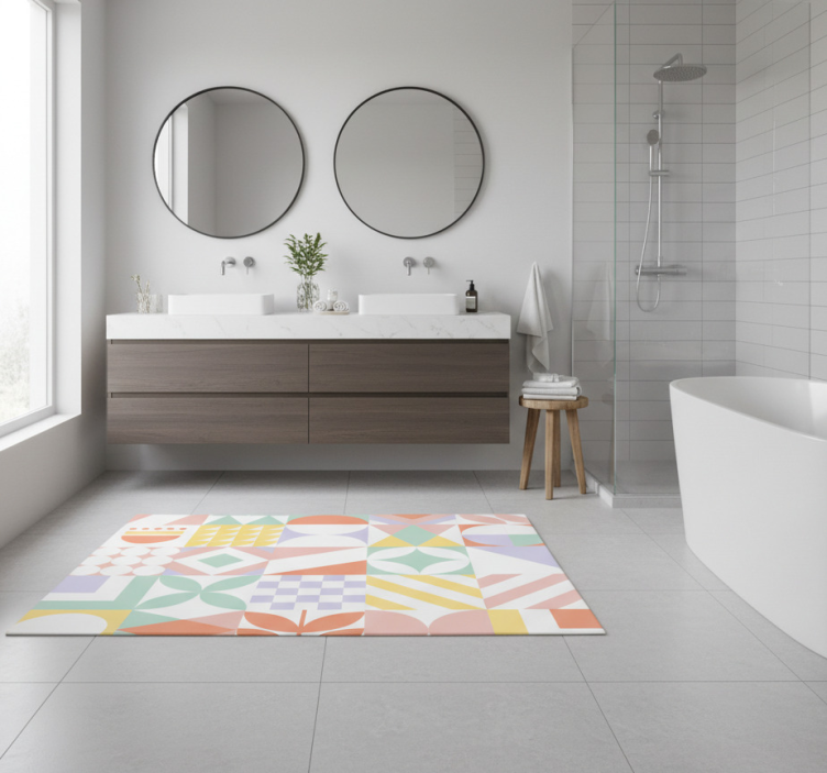 Referentienummer: R23294Ontdek de magie van ons Vinyl vloerkleed badkamer ongewone vormen, een visueel spektakel dat elke badkamer transformeert! Dit vloerkleed valt op door zijn unieke geometrische ontwerpen en levendige kleuren die een speelse sfeer creëren. Het is niet alleen een lust voor het oog, maar ook praktisch, met eigenschappen zoals antislip en krasbestendigheid, wat zorgt voor zowel veiligheid als duurzaamheid.